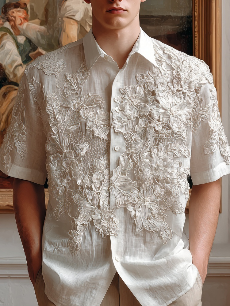 Bohemian Style Three-dimensional Embroidered Flowers, Vintage Linen Lightweight Men's V-neck Short-sleeved Shirt