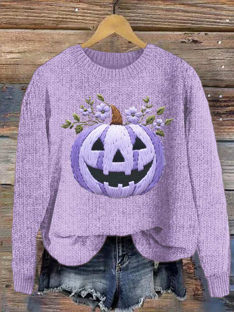 Emoji Pumpkin & Floral Hand Embroidered Women's Cozy Sweater