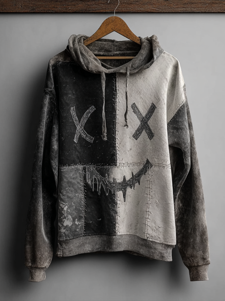 Halloween Ghost Face Distressed Patchwork Hooded Sweatshirt