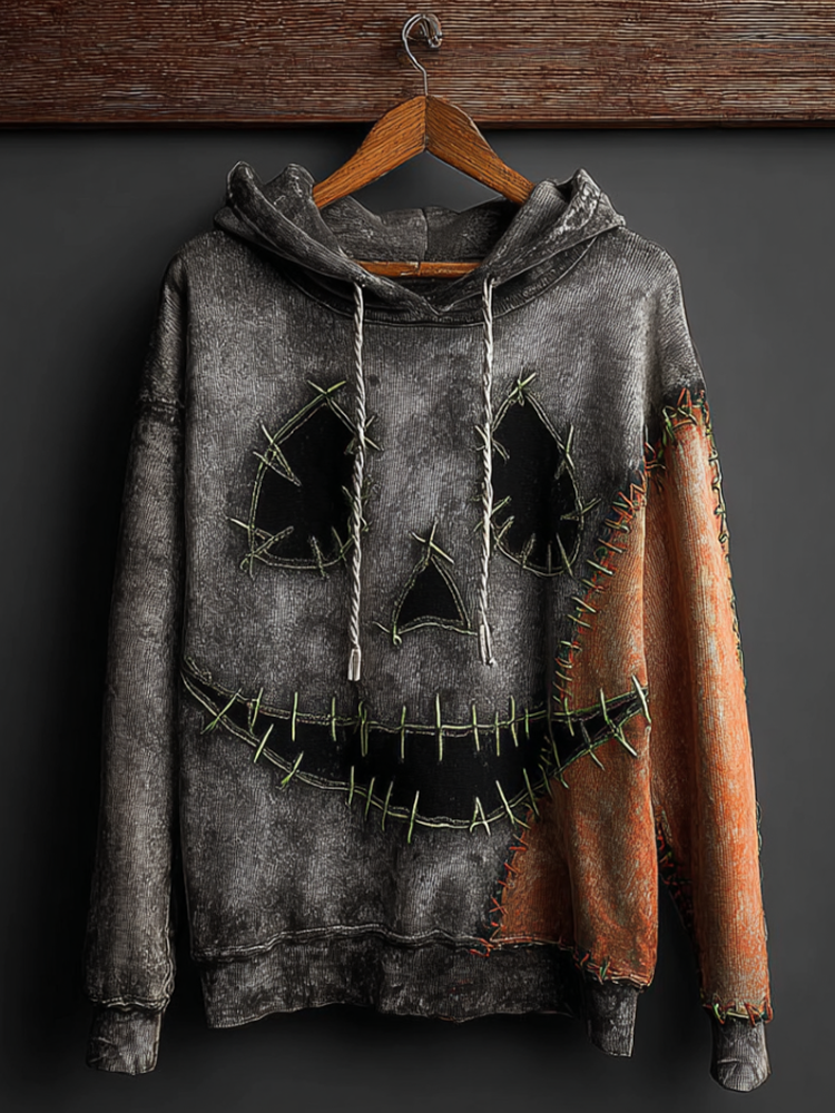 Halloween Ghost Face Distressed Patchwork Hooded Sweatshirt