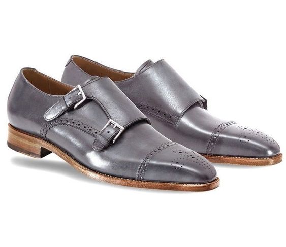Handmade Gray Leather Oxford Brogue Toe Cap Double Buckle Monk Strap shoes