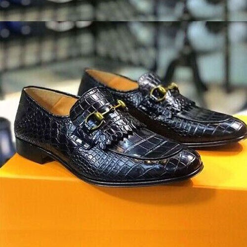 Handmade Men black crocodile fringe moccains , Men black alligators loafer