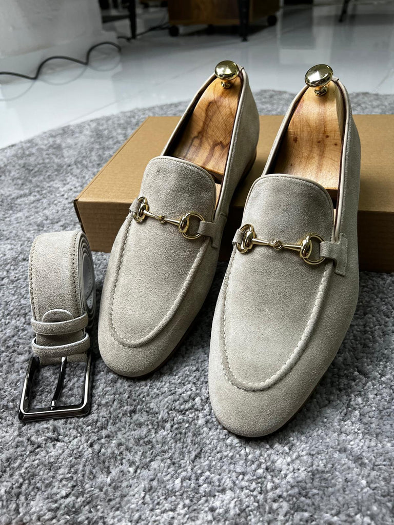 Handmade Men Light Gray Suede Leather Moccasin Shoes, Bit Loafers, Slip ons