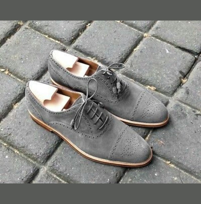 Handmade Mens Light gray suede brogue shoes, Men gray dress shoes