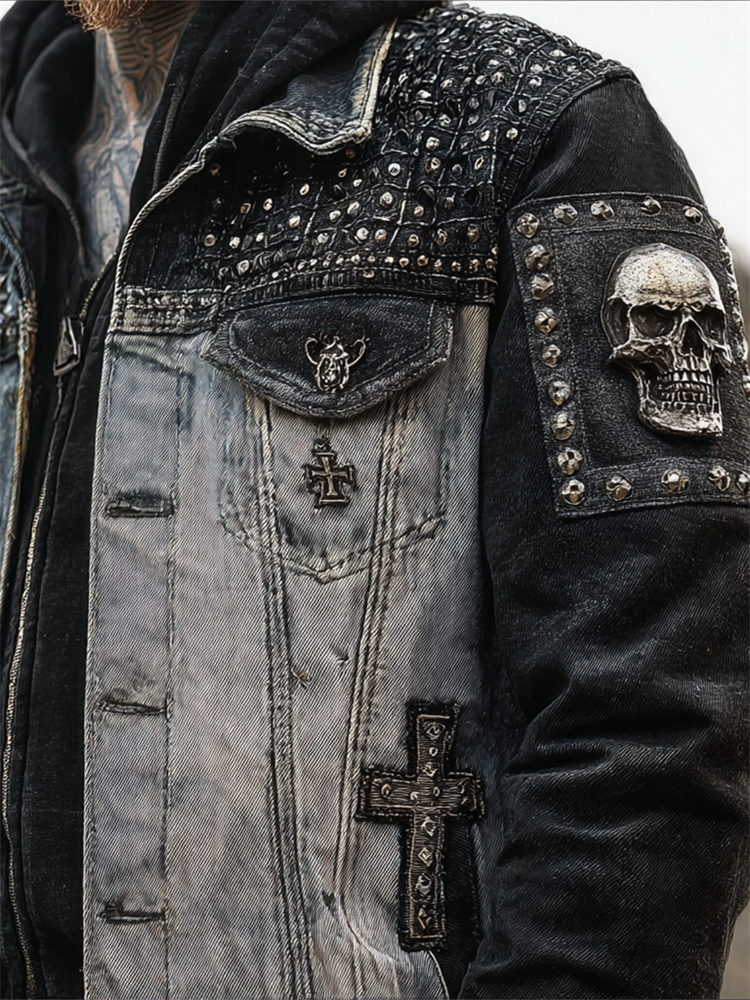 Men's Rock Skull Cross Contrast Patchwork Washed Denim Jacket