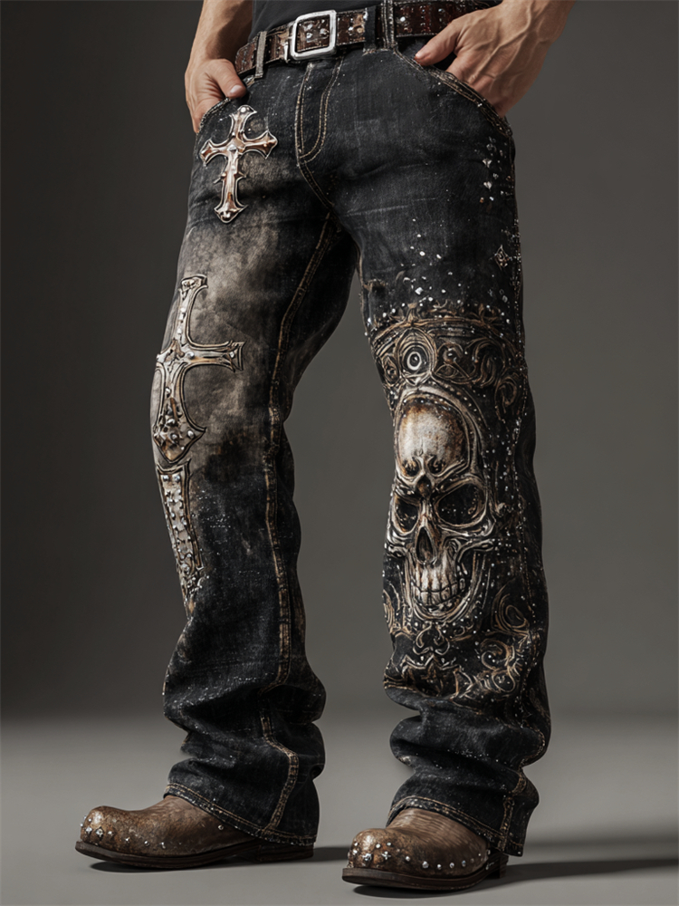 Men's Rock Skull Cross Studded Washed Bootcut Jeans