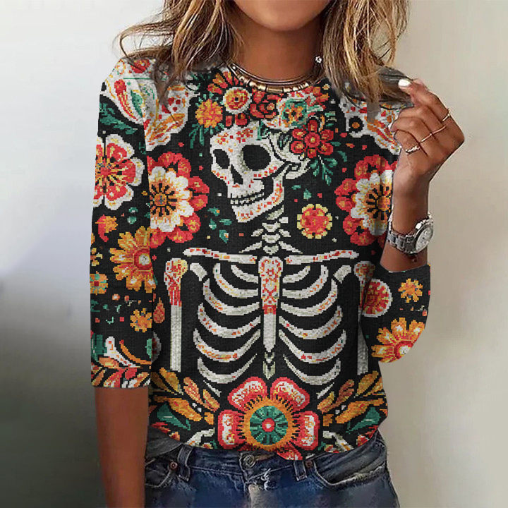 Mexican Day Of The Dead Skull Print Casual Long-sleeved T-shirt