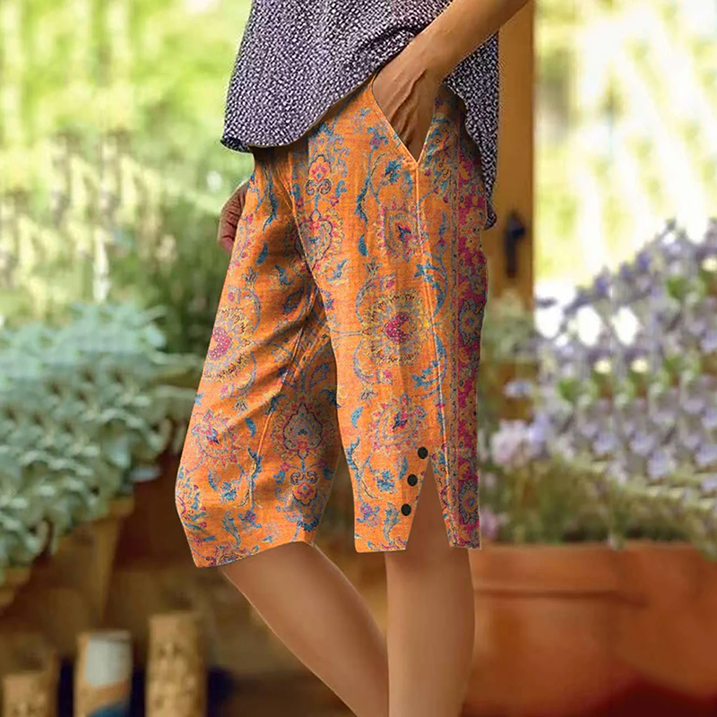 Retro Bohemian Style Ethnic Totem Pattern Art Graphics Button Slit Design Cozy Linen Shorts