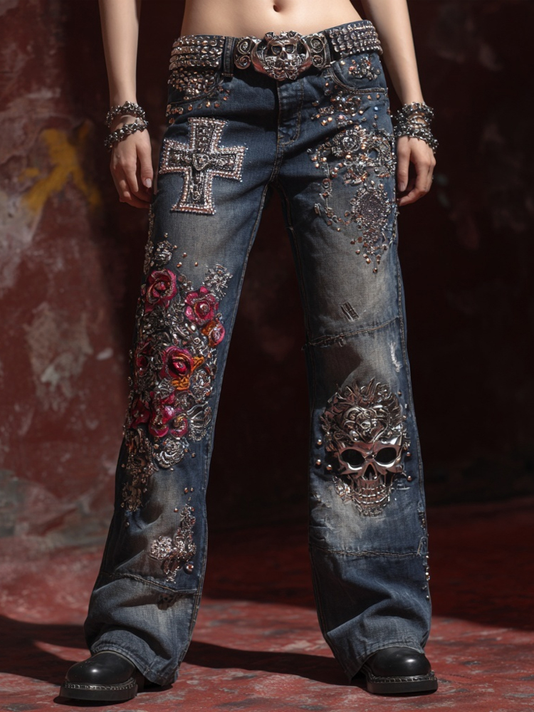 Retro Rock Style Skulls & Cross Studded Distressed Bootcut Jeans