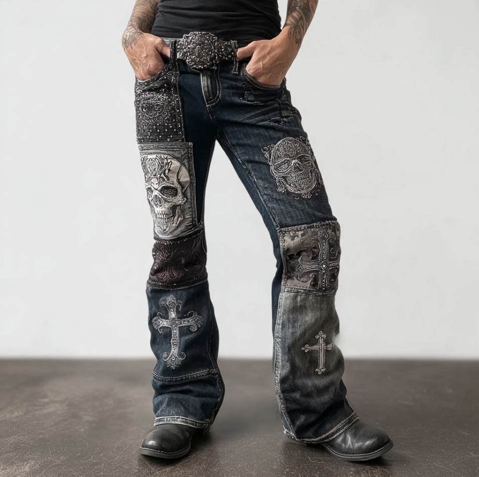 Rock Punk Skull Cross Element Retro Distressed Heavy Workwear Men's Denim Long Pants