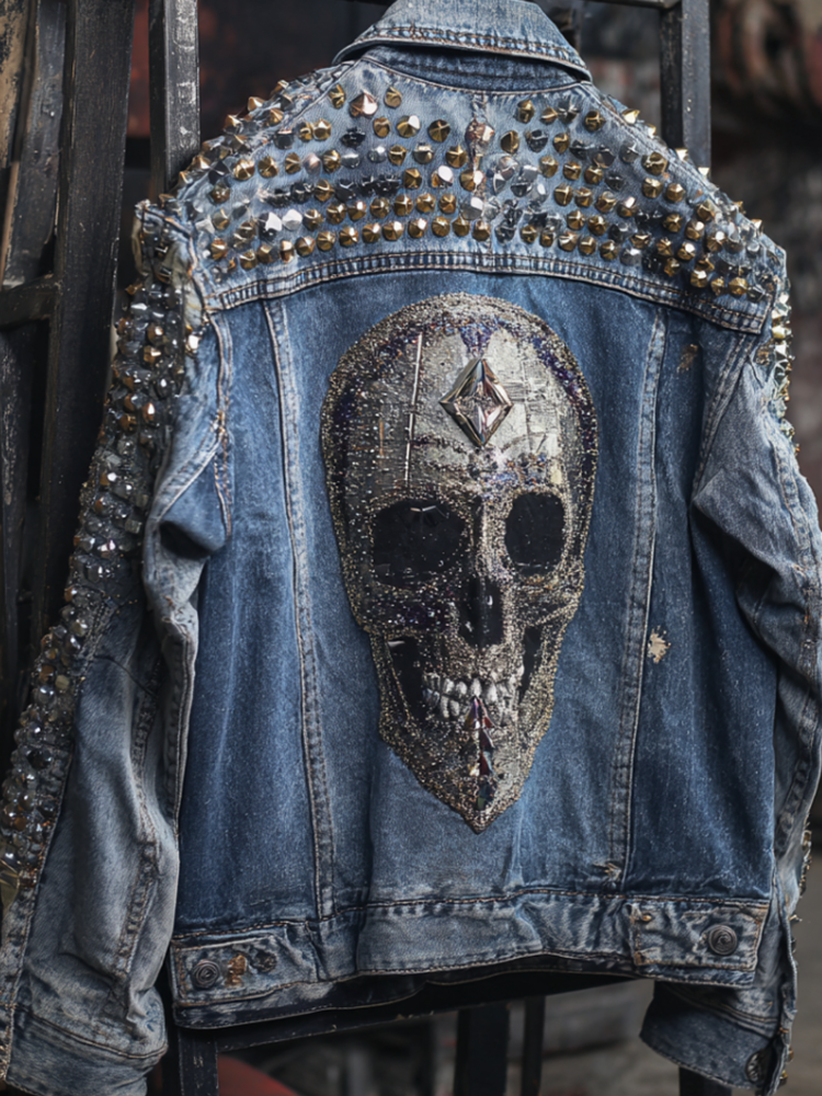 Rock Punk Skull Rivet Element Retro Distressed Heavy-duty Men's Denim Jacket
