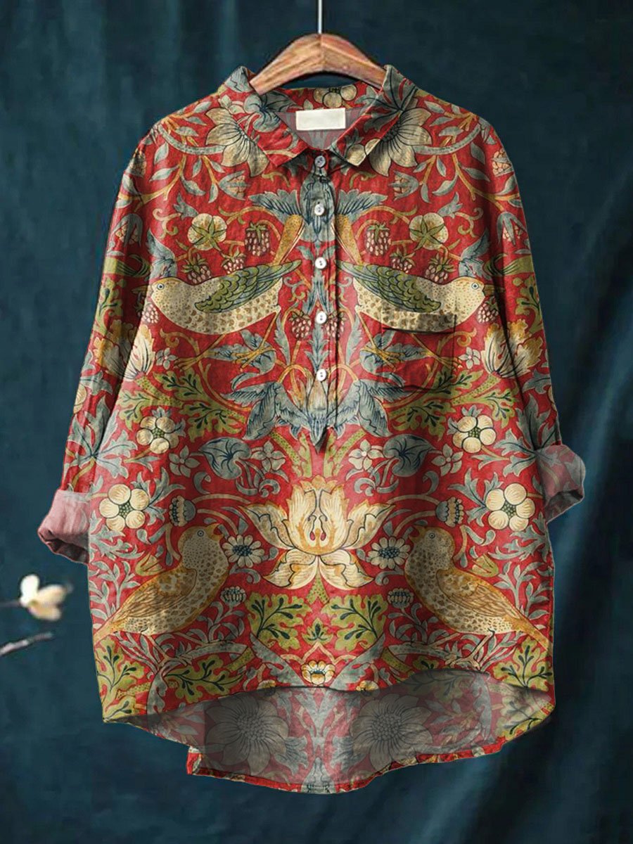 Vintage Ethnic Lovely Birds Floral Art Print Casual Cotton And Linen Shirt