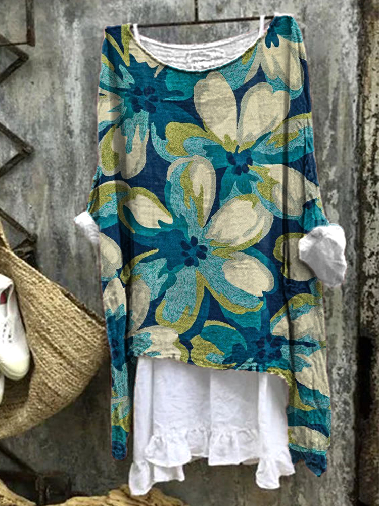 Vintage Floral Art Pattern Linen Loose Long Shirt