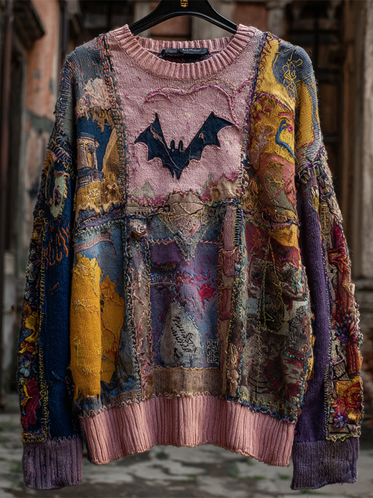 Vintage Halloween Bat Patchwork Art Men's Sweater