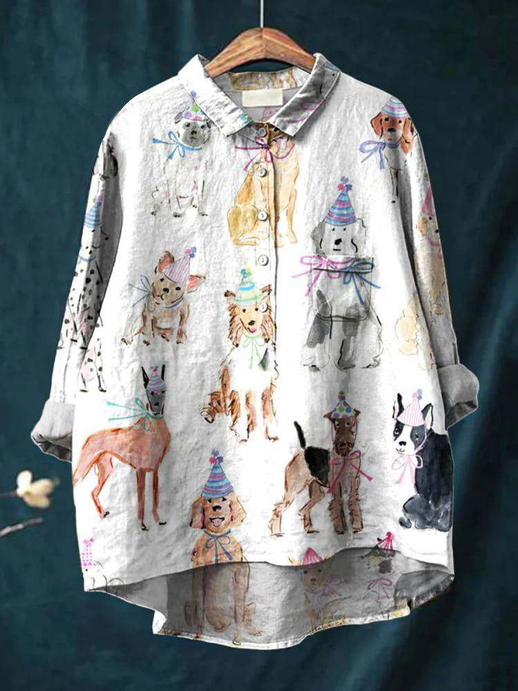 Women's Birthday Hat Cartoon Dog Print Casual Cotton And Linen Shirt