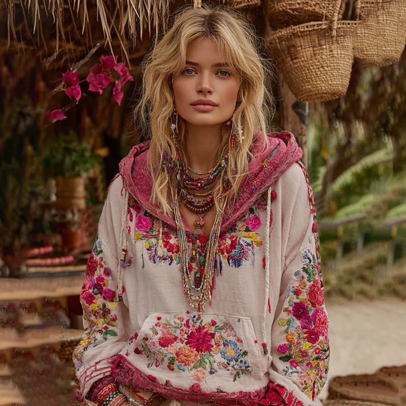 Women's Bohemian Floral Embroidery Art Casual Cotton Linen Hoodie
