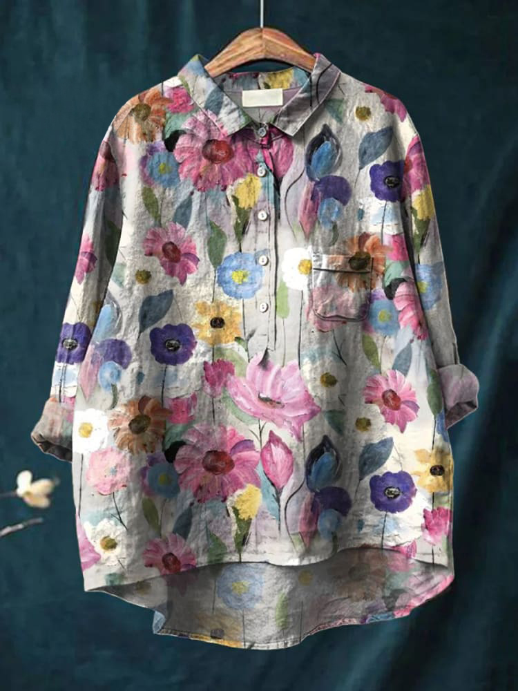 Women's Colourful Textured Floral Print Casual Cotton And Linen Shirt