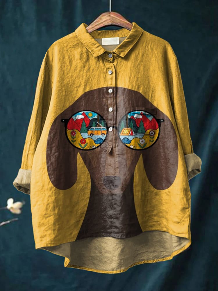 Women's Fun Puppy with Sunglasses Print Casual Cotton And Linen Shirt