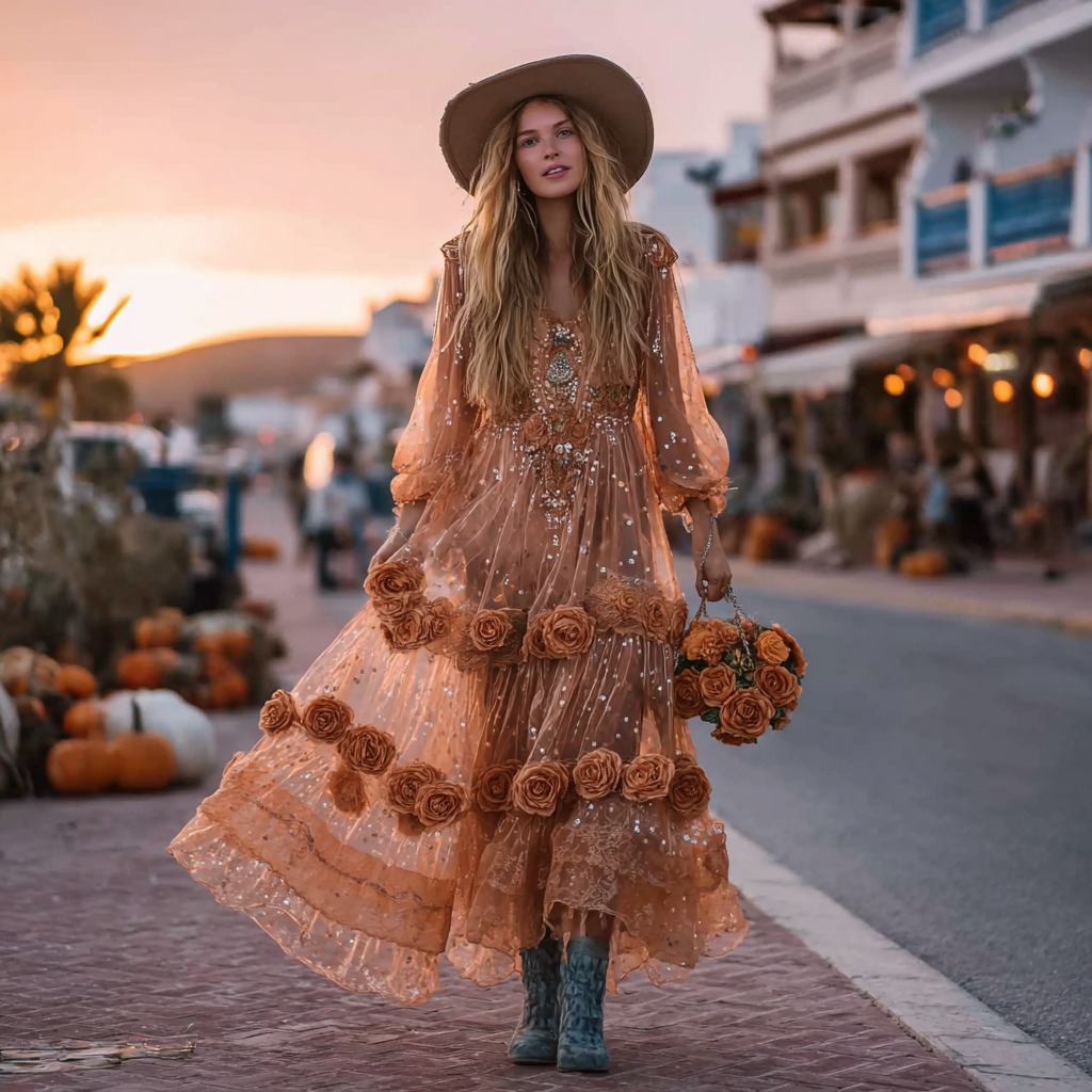 Women's Orange Rose Gilded Pattern Elegant Long Sleeve Dress