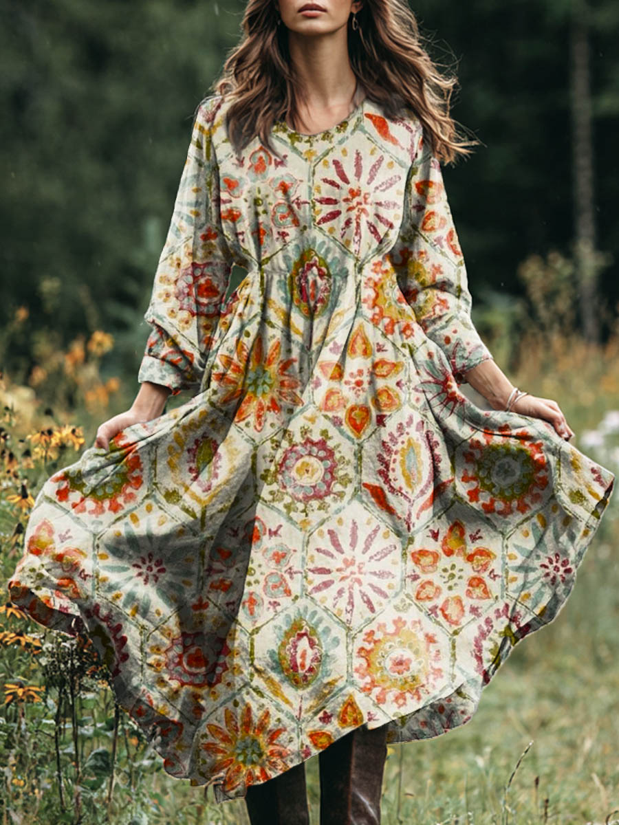 Women's Vintage Floral Pattern Art Print Cotton Ad Linen Dress