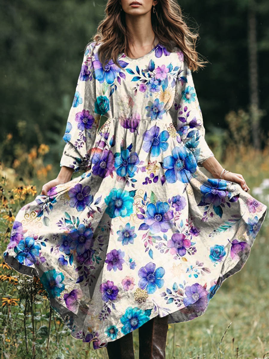 Women's Vintage Floral Pattern Art Print Cotton Ad Linen Dress