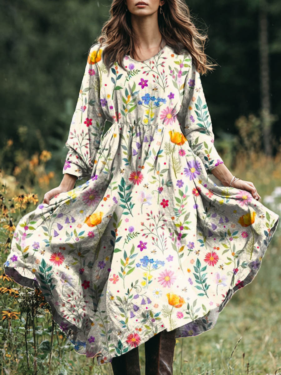 Women's Vintage Floral Pattern Art Print Cotton Ad Linen Dress