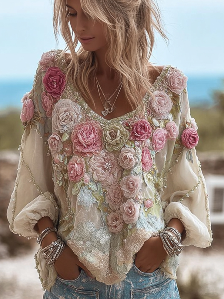 Women's Vintage Floral V-neck Long-sleeved Top